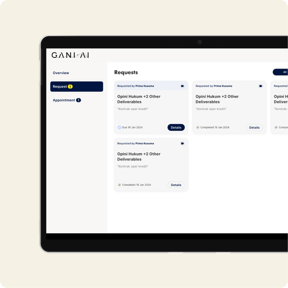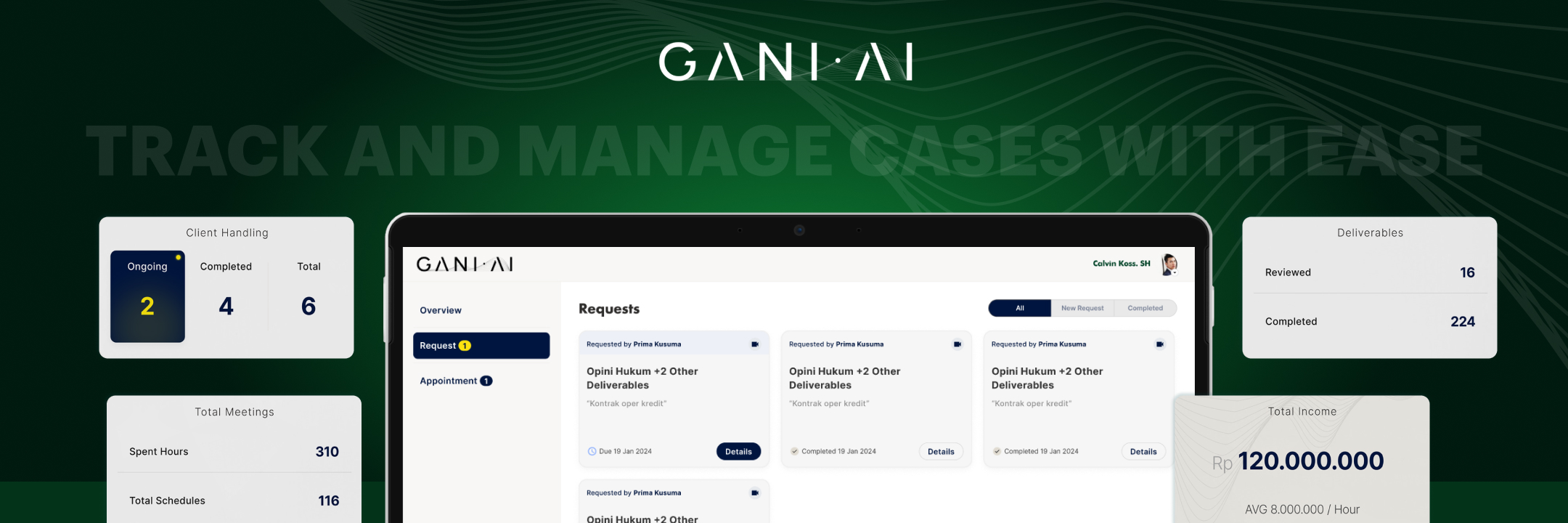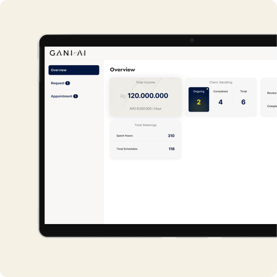 The GANI.AI Overview Page is a centralized dashboard designed to give legal professionals a comprehensive summary of their performance and activities. It provides key metrics such as total income, client handling progress, deliverables status, and meeting engagements. The interface is clean, user-friendly, and equipped with navigation options to access requests and appointments easily. The page also includes a time filter for data customization and