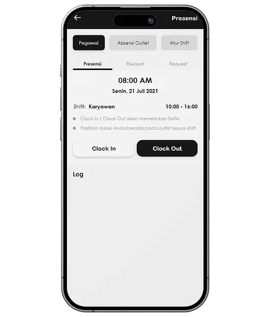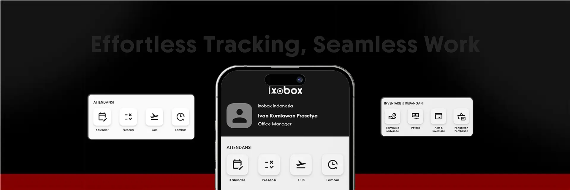 The home page of the IXOBOX Employee App serves as the central dashboard for employees, displaying key features such as attendance tracking, leave requests, overtime management, and financial tools like reimbursements, payslips, and asset inventories. The top section highlights the user's profile, including their name, position, and company affiliation. Below, categorized icons provide quick access to essential HR functions, ensuring employees can efficiently manage their schedules and financial transactions. Additionally, an announcement section keeps users informed about company updates, ensuring seamless communication between management and employees. The intuitive layout enhances user experience, making navigation straightforward and efficient.
