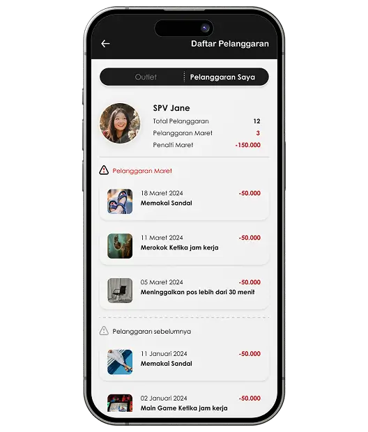 This page allows users to view a list of their recorded violations within a selected time period, filtered by month and outlet. It provides an overview of infractions committed by employees for better monitoring and compliance.