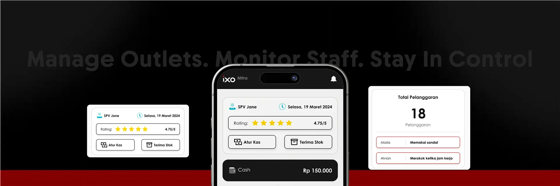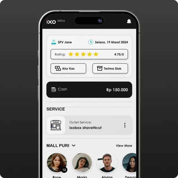 The IXOBOX Outlet page (Outlet Leader - Home) serves as the main dashboard for Outlet Leaders to monitor outlet operations efficiently. This page displays user information, operational dates, and customer ratings. Key features include Manage Cash to manage transactions and Receive Stock to record incoming goods. Customer payment status is also displayed, such as payment method (Cash) and total transaction. In addition, the outlet's main services, such as "ixobox shaveNCut", as well as a list of hairstylists on duty with the number of customers they handle can be monitored directly.