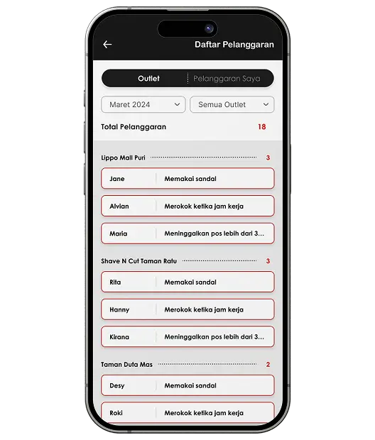 Displays a categorized list of violations by outlet, showing the offender’s name and the type of violation committed, along with the total number of violations recorded for easy tracking.