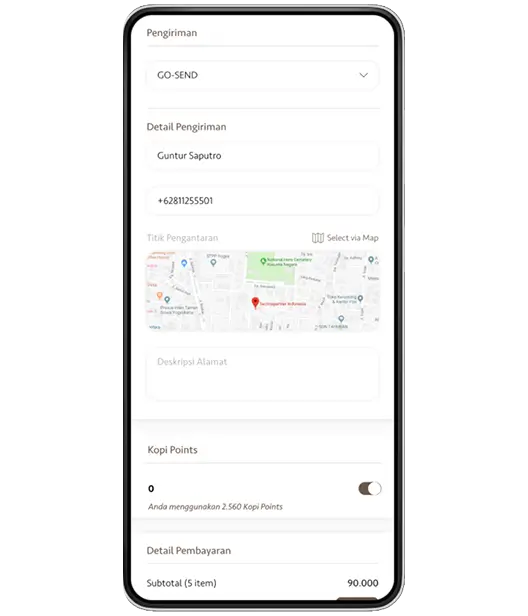 Streamlines the order experience by integrating delivery partners (like GoSend), precise location selection with map support, and flexible use of loyalty points. Designed for speed and clarity, it ensures a frictionless, user-friendly flow from cart to confirmation—right from your fingertips.