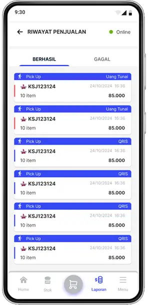 This Sales Report module provides riders with a clear and organized overview of their transaction history. The design features an intuitive tab-based navigation to separate "Successful" and "Failed" orders, which simplifies the review process. Each transaction is displayed on an easy-to-scan card, highlighting crucial details like payment method, order specifics, and total value. This streamlined approach empowers riders to effortlessly track their performance, reconcile daily earnings, and maintain a transparent record of their sales directly within the app.