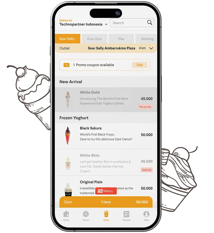Technopartner Indonesia developed the Sour Sally Group Apps, a mobile application that unifies all brands under one platform. With a centralized loyalty program, intuitive ordering system, and secure digital payments, the app enhances customer convenience and brand engagement. Optimized for mobile devices, it ensures that users can explore menus, place orders, and access promotions effortlessly, anytime and anywhere.